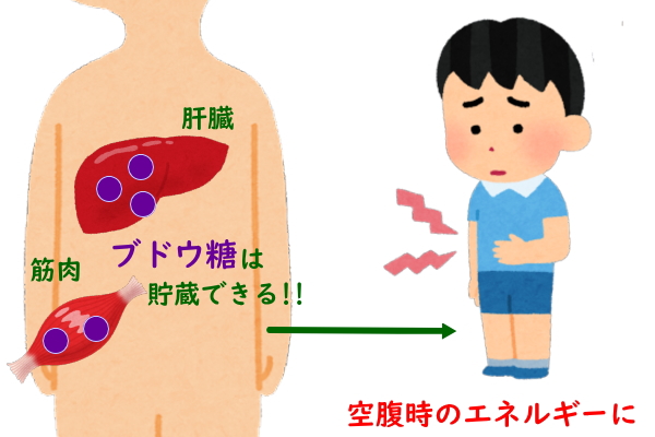 ブドウ糖はとても優秀な栄養素で、血液を通って体内に行きわたり、体を動かすエネルギー源としてすぐに活用されますが、今すぐに使わない分については空腹時の予備食として筋肉や肝臓に貯蔵されます。