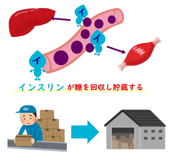 そして血液中のブドウ糖を血液から回収して貯蔵するために働くのがインスリンという超重要なホルモンです。