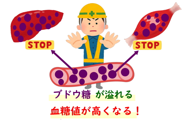 必要以上に糖を摂りすぎてしまうと、それ以上貯めることができなくなり、血液中にブドウ糖が溢れていきます。