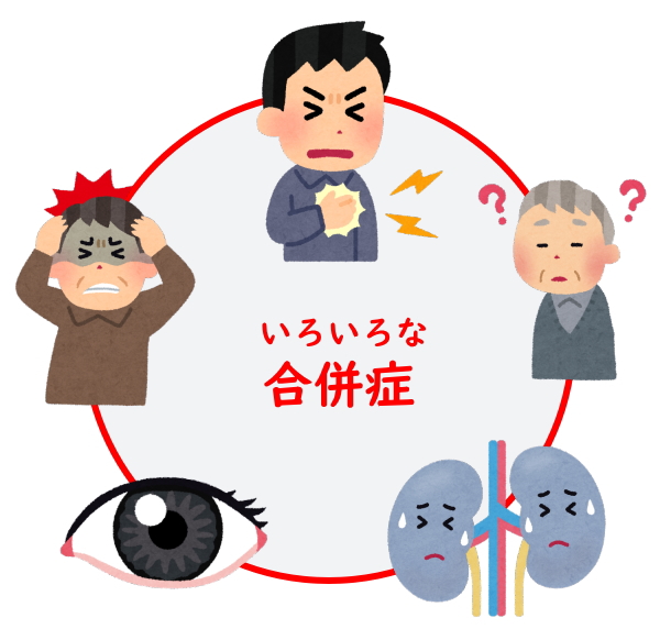糖尿病はとても怖い病気で、心筋梗塞、脳梗塞、認知症、失明の危険のある眼底出血、腎障害、神経障害などさまざまな合併症を引き起こす可能性があります。