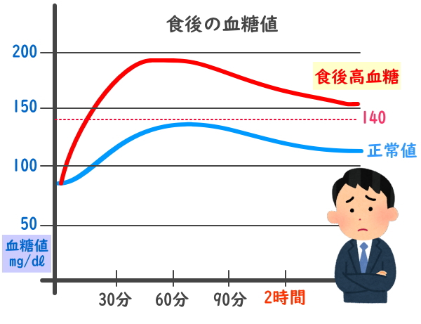食後は糖質を摂取すれば誰でも一時的に血糖値は上がりますが、通常は2時間くらいで元の状態まで戻ります。