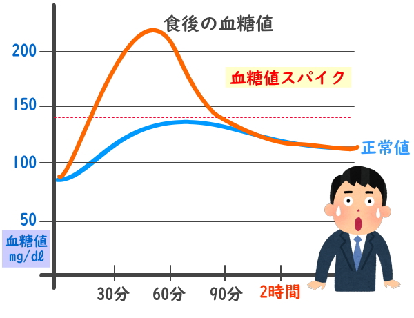 またもうひとつ、食後急激に上がりすぎてしまう状態を「血糖値スパイク」といいます。