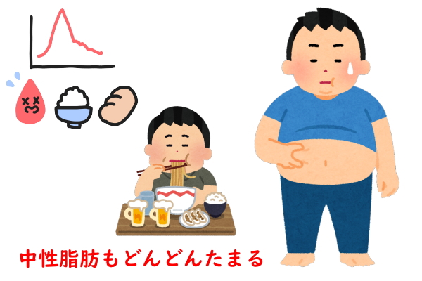 また食後に高血糖な状態が長く続くと、中性脂肪を体に貯め込みやすくなっていきます。