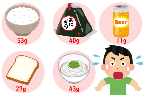 ごはん中盛で53g、コンビニおにぎり40g、ビール500mlは11g、6枚切り食パン27g、うどん43g…