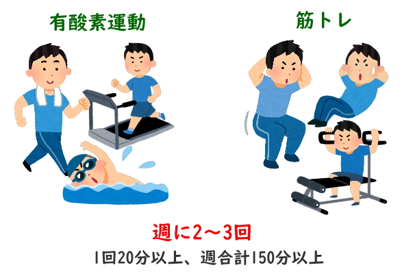 血糖値を下げるにはややきついと感じるくらいの有酸素運動(ウォーキングやジョギングなど)や、筋トレ(スクワットなど)を継続的に行うことが推奨されています。