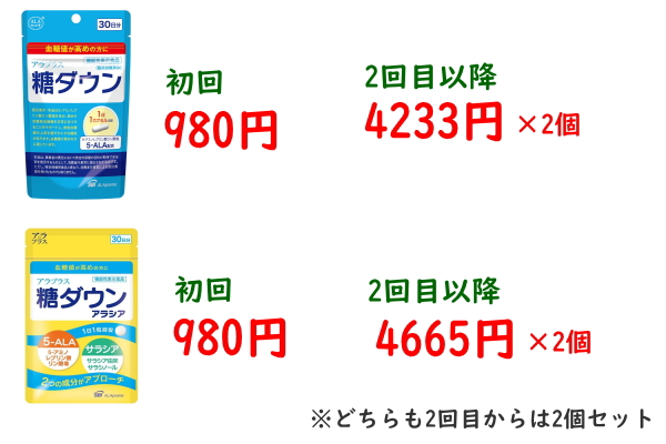 どちらも980円で試すことができるで、初めは通常の糖ダウンを買ってみて、少し続けてから黄色の方も試してというように、どちらも試してみて最終的に決めるというのでもいいかもしれませんね。